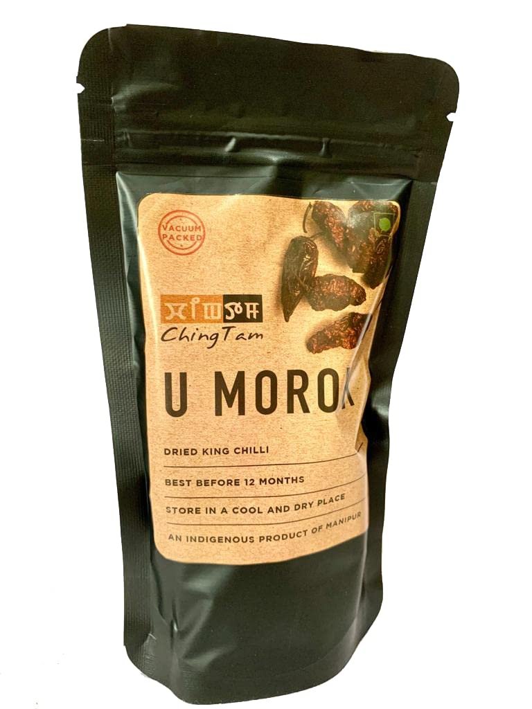 Presenting to you from the serene and cool hills of Manipur, the King of all chillies, U-Morok, also known as Bhoot Jolokia. It is one of the hottest chillies in the world. It can be eaten fresh or in dried/pickle form. A little bit of U-Morok in a dish lends a very palatable flavour and uplifts the whole dish. It can be used in small quantities in almost all vegetarian and non-vegetarian dish preparations. Caution: More than 1,000,000 SHU (Scoville Scale) 400 times hotter than Tabasco sauce, please do not use indiscriminately.